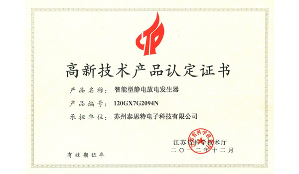 蘇州泰思特自主研發(fā)的智能型靜電放電發(fā)生器(手持式靜電放電模擬器)獲“江蘇省高新技術(shù)產(chǎn)品”認(rèn)定證書。