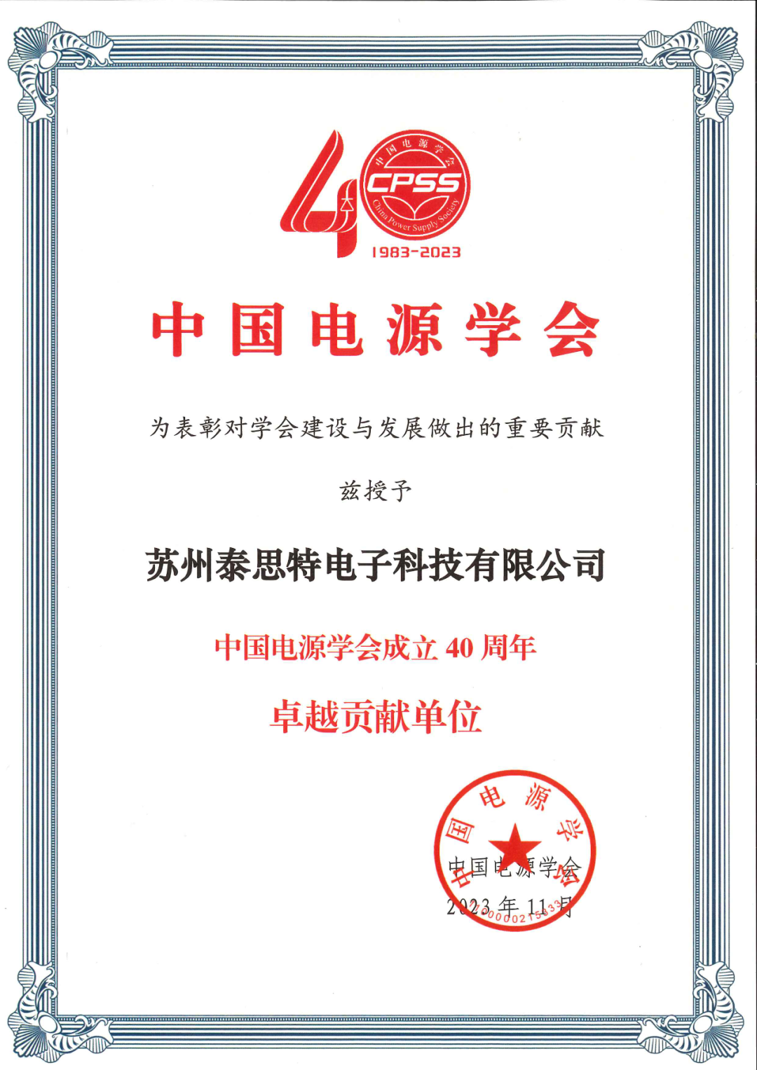 蘇州泰思特電子科技有限公司多年來一直積極參與學(xué)會活動,緊跟電源科技發(fā)展腳步,不斷提升企業(yè)產(chǎn)品競爭力和技術(shù)研發(fā)實力,致力于推動電源行業(yè)發(fā)展。為此學(xué)會授予蘇州泰思特電子“中國電源學(xué)會成立40周年卓越貢獻單位獎” ,充分體現(xiàn)了學(xué)會對蘇州泰思特電子作為企業(yè)對學(xué)會各項工作所做出的努力與貢獻的認可。蘇州泰思特電子也將繼續(xù)與學(xué)會緊密合作,共推、共享電源科技領(lǐng)域的未來發(fā)展和產(chǎn)業(yè)繁榮。