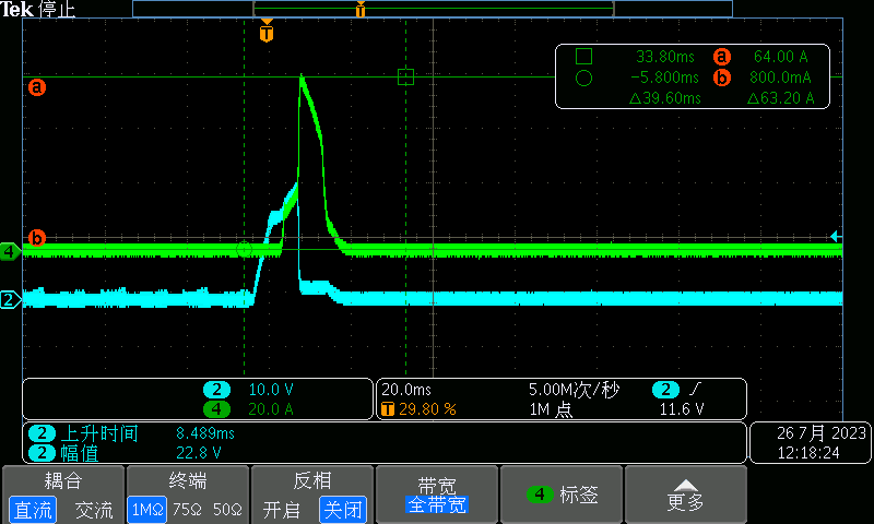 電流Ir=(Up-UL)/Ri。測(cè)試案例2中,Ir=(30-14)/2=8A。就算TVS已經(jīng)擊穿,UL電壓為0,則Ir=(30-0)/2=15A。而實(shí)測(cè)峰值電流63A,遠(yuǎn)遠(yuǎn)大于理論值。