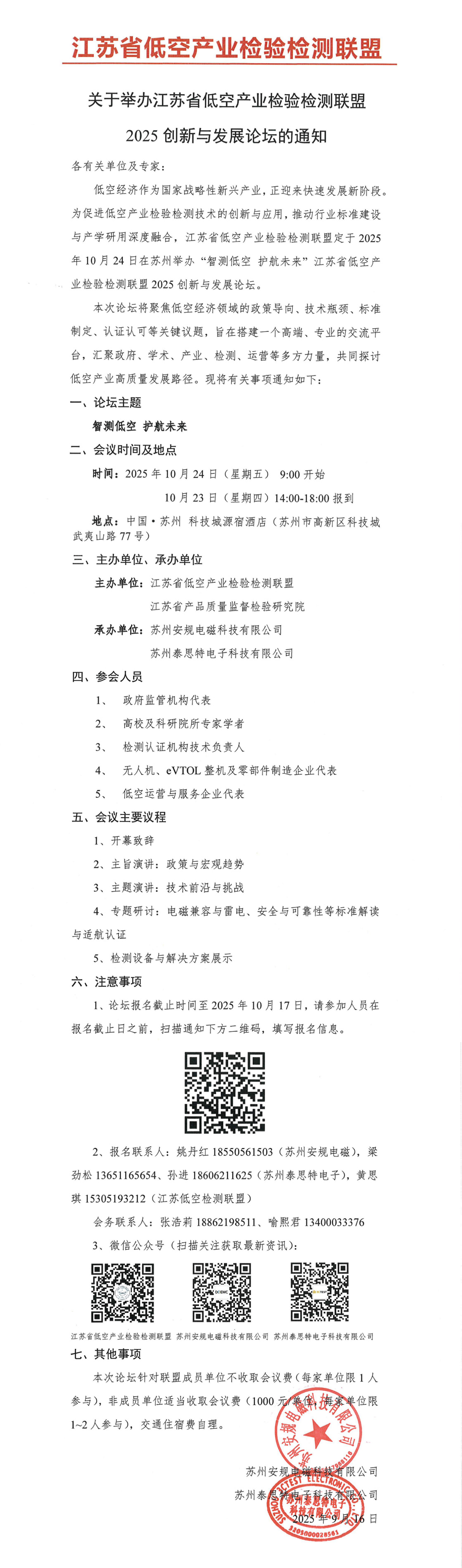 為積極響應(yīng)國家低空經(jīng)濟(jì)戰(zhàn)略部署,推動低空產(chǎn)業(yè)檢驗(yàn)檢測技術(shù)跨越式發(fā)展,江蘇省低空產(chǎn)業(yè)檢驗(yàn)檢測聯(lián)盟將于2025年10月24日在蘇州科技城源宿酒店隆重舉辦“江蘇省低空產(chǎn)業(yè)檢驗(yàn)檢測聯(lián)盟2025創(chuàng)新與發(fā)展論壇”。本次論壇由蘇州泰思特電子科技有限公司承辦,旨在匯聚行業(yè)智慧,共商低空產(chǎn)業(yè)高質(zhì)量發(fā)展創(chuàng)新路徑與發(fā)展方向。