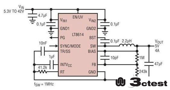 另外,LT8614 最低輸入工作電壓典型值僅為 2.9V 最高 3.4V,所以該器件能在有壓差時(shí)提供 3.3V 軌。大電流情況下 LT8614比 LT8610/11 的效率更高,這是因?yàn)樗偟拈_關(guān)電阻較小。該器件還可以同步至 200kHz 至 3MHz 的外部頻率。