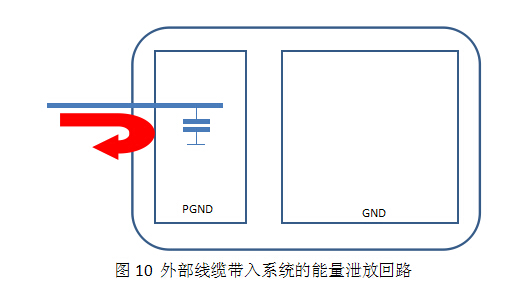 圖10所示是針對外部線纜的EMC設(shè)計,這部分能量可能是共模形式,也可能是差模形式,在電路中所選擇的濾波防護器件就會有所不同。重點就是這部分能量我們不希望他流到系統(tǒng)內(nèi)部,需要在IO端口處就解決問題,這時候PGND的意義就非常重大。