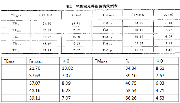 表2列舉了通過公式2計(jì)算的屏蔽室內(nèi)幾個(gè)低次模的諧振頻率。