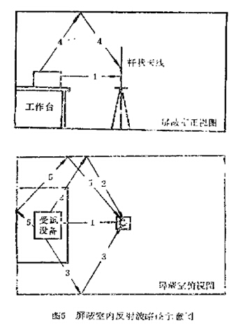屏蔽室內(nèi)因存在激勵(lì)源而引起的另物理現(xiàn)象是電磁波的反射。在對(duì)受試設(shè)備進(jìn)行輻射發(fā)射測試時(shí),接收天線除了接受來自受試設(shè)備的直接輻射外,還有來自屏蔽室腔體表面(包括地面、天花板以及墻壁)的反射波,如圖5所示。