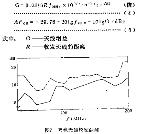 圖7說明,測試天線架高2m,距離1m。在開闊場地測量時(shí),天線周圍3m距離范圍之內(nèi)無障礙物,在屏蔽到內(nèi)測量時(shí),天線置于屏蔽室的幾何中心利用(4)(5)兩式即可給出天線校準(zhǔn)系數(shù)的頻響關(guān)系曲線。圖7給出了雙錐天線在開闊場與屏蔽室內(nèi)的校準(zhǔn)曲線。從上圖中我們發(fā)現(xiàn),在30~200MHz范圍內(nèi),雙錐天線在開闊場與屏蔽室內(nèi)的校準(zhǔn)曲線具有大致相同的趨勢。由于屏蔽室內(nèi)存在反射現(xiàn)象,因而天線系數(shù)明顯高于自由空間開闊場的校準(zhǔn)系數(shù)。
