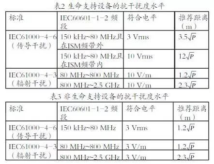 IEC 60601-1-2《醫(yī)用電氣設備1-2部分:安全通用要求并列標準:電磁兼容要求和試驗》中,規(guī)定了對生命支持設備和非生命支持設備的電磁抗擾度,他們的抗干擾水平分別為10 V/m 3V/m[9] 。生命支持設備主要指呼吸機、血透機等對維持患者生命起著關鍵作用的醫(yī)療設備,相較于非生命支持設備,這類設備的安全性能要求更為嚴格,抗電磁干擾水平也高于非生命支持設備。在IEC61000-4-3《電磁兼容性(EMC)4-3部分:測試及測量技術?放射性、射頻式、電磁場抗干擾度試驗》針對所有電子電氣設備的電磁兼容標準中,醫(yī)療設備屬于其中的水平等級3和水平等級2[10-11]。低頻率的干擾主要來源于傳導發(fā)射產(chǎn)生的干擾電壓;而高頻率的干擾主要來源于輻射發(fā)射產(chǎn)生的電磁干擾場強。同時在IEC60601-1-2標準中,也給出了在電磁環(huán)境中醫(yī)療設備抗干擾度的推薦距離,在相同的發(fā)射功率下,生命支持設備的抗電磁干擾水平要高于非生命支持設備,推薦距離也相對較遠,如表2~3所示。