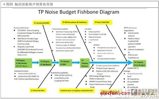 在量測(cè)出觸控面板本身的噪聲后,并設(shè)定出合理的噪聲預(yù)算值后,就可以開始進(jìn)行觸控面板對(duì)各種不同模塊的噪聲量測(cè),圖四的觸控面板噪聲預(yù)算魚骨圖,就是我們根據(jù)經(jīng)驗(yàn)歸納研究出的量測(cè)與驗(yàn)證順序,必須透過(guò)對(duì)噪聲預(yù)算的控制,來(lái)觀察觸控面板對(duì)不同模塊的干擾狀況。在圖五的實(shí)際量測(cè)圖中,紅線部分便是我們?cè)O(shè)定的噪聲預(yù)算值,而我們的目標(biāo)就是將噪聲值降低到紅線以下。