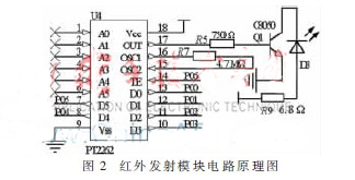 紅外電路設(shè)計采用PT2262、PT2272兩款芯片來完成光波發(fā)射與接收的編碼與解碼。這兩款芯片功耗低,使用方便。對高頻電路完成ASK調(diào)制,相當(dāng)于調(diào)制度為100%的調(diào)幅。
