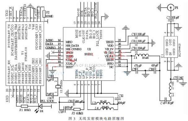 圖3為無線發(fā)射模塊電路圖,單片機的讀入讀出串口與無線發(fā)射芯片之間通過RXD和TXD進行連接通信??刂菩盘栕罱K通過圖3中P1天線發(fā)送出去。