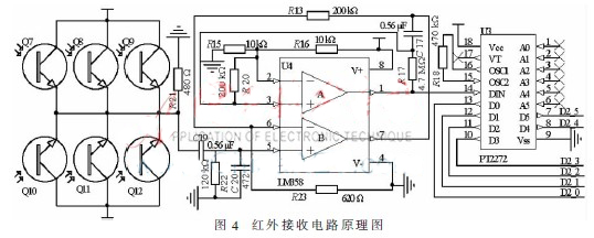無線信號、紅外信號和激光信號接入進來后分別通過串口(USART1-RX/USART1-TX)以及GPIO口與ARM芯片進行連接。圖4為接紅外接收模塊電路圖。激光通信模塊的電路圖基本與紅外接收模塊一致,只是將6個紅外接收光敏二極管改為了6個激光接收器。而無線接收模塊同樣使用了圖3所示電路模塊進行通信。