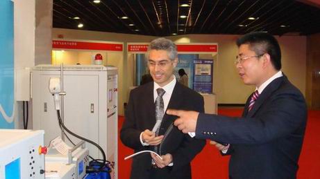 泰思特客服經(jīng)理向EMC專家沙斐(北方交通大學(xué)教授)介紹新產(chǎn)品EMI傳導(dǎo)噪聲分析儀