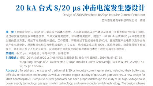 泰思特電子楊銘在《安全與電磁兼容》雜志2024年第04期發(fā)表一篇《20kA臺式8/20μs沖擊電流發(fā)生器設計》 論文,與您一起分享。