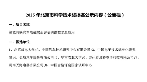 我司參與的“智能網(wǎng)聯(lián)汽車電磁安全評(píng)估關(guān)鍵技術(shù)及應(yīng)用”提名項(xiàng)目進(jìn)行公示,公示期:2025年6月 20日至2025年6月26日。