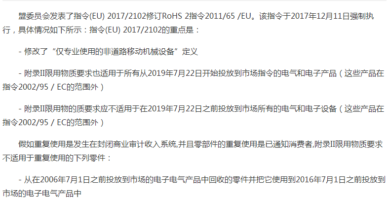 盟委員會發(fā)表了指令(EU) 2017/2102修訂RoHS 2指令2011/65 /EU。該指令于2017年12月11日強(qiáng)制執(zhí)行,具體情況如下所示:指令(EU) 2017/2102的重點(diǎn)是: