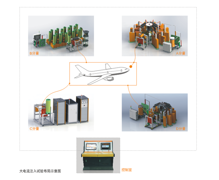 飛機(jī)在強(qiáng)對(duì)流天氣飛行時(shí),容易受到雷電的直接附著作用,產(chǎn)生高溫、高壓和強(qiáng)電磁力,對(duì)飛機(jī)造成燃燒、溶蝕、爆炸、結(jié)構(gòu)畸變和強(qiáng)度降低等效應(yīng)。我司自主研發(fā)的飛機(jī)整機(jī)防雷測(cè)試系統(tǒng)是一套非常復(fù)雜的脈沖電流測(cè)試系統(tǒng),完全符合美軍標(biāo)MIL-STD-464C、SAE ARP5412DO160 section23等飛機(jī)防雷標(biāo)準(zhǔn)要求,模擬飛機(jī)的直接附著雷擊區(qū)域應(yīng)承受由ABCD四個(gè)波形組成的連續(xù)波形進(jìn)行直接效應(yīng)雷擊,整套系統(tǒng)包含4套脈沖電流發(fā)生器。