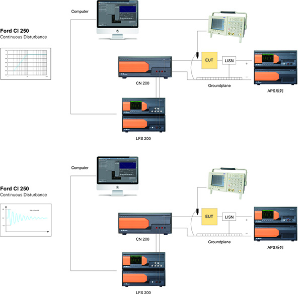 按照CI 210的要求,LFS 200可產(chǎn)生出控制信號(hào)并驅(qū)動(dòng)例如APS 40C30這樣的直流源來(lái)進(jìn)行電源線連續(xù)騷擾抗擾的測(cè)試。